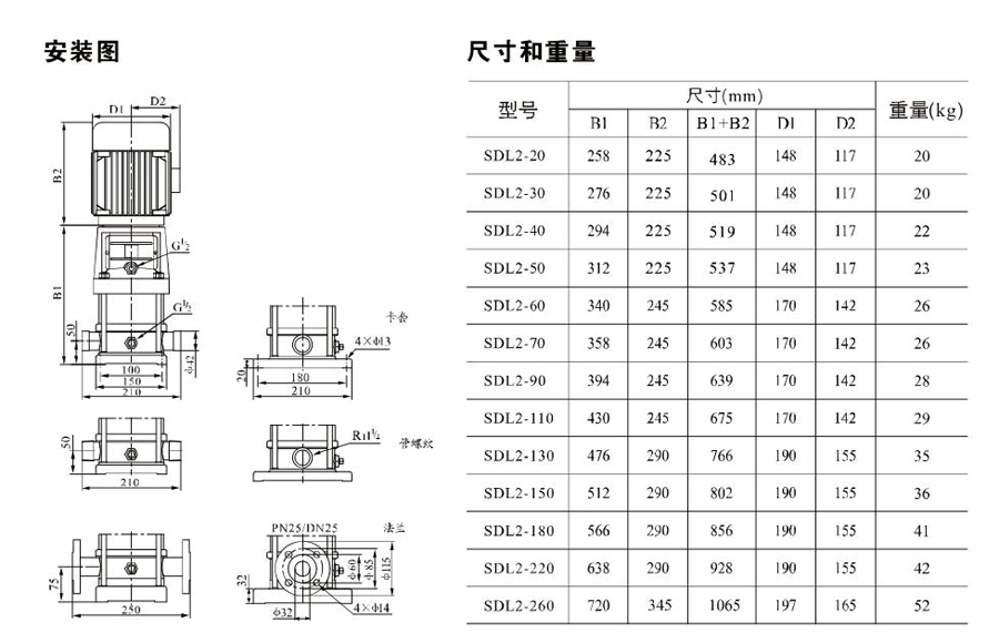 SDL2/SDLT2為配用標準電機的非自吸立式多級離心泵,電機軸和泵軸用聯(lián)軸器直接聯(lián)接,把拉桿用螺母將外筒,過流部件固定在支架和進出水體之間,泵進出水口在泵底部的同一直線上。泵可根據(jù)需要配置智能保護器,對泵的干轉、缺相、過載等進行有效的保護。