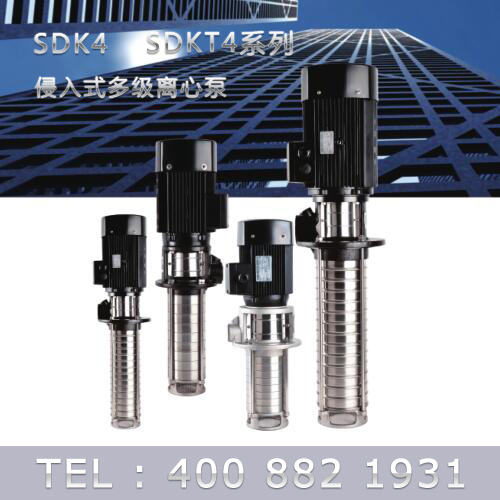 SDK4/SDKT4為配用標準電機的非自吸立式多級離心泵,電機軸和泵軸用聯(lián)軸器直接聯(lián)接的結構。為滿足水槽或容器的安裝深度,可安裝空套的腔體來改變泵本身的侵入 深度。