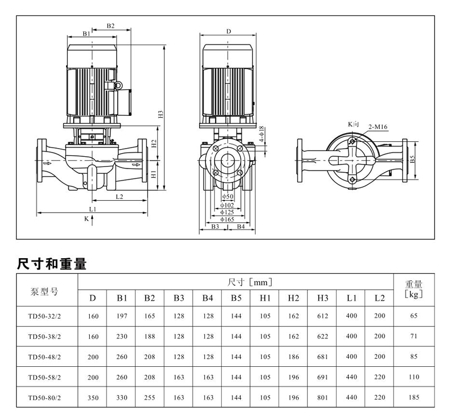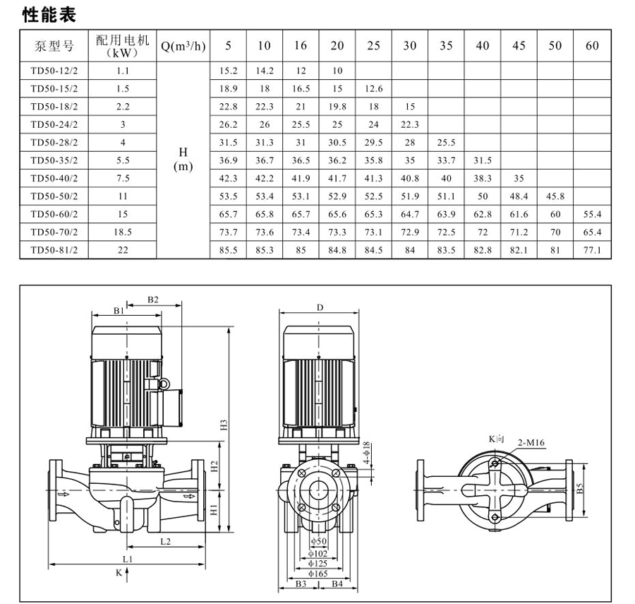 TD50系列單級管道離心泵,配有標準電 機和機械密封。此類產品的結構與相近類型產品相比,更不易受到泵送液體中雜質的影響。產品設計為頂部可拉出的拆裝形式,其可 以在不影響管路系統的情況下對泵進行維修。所有泵采用創(chuàng)新式便拆式機械密封,更好機械密封無需拆卸電機。